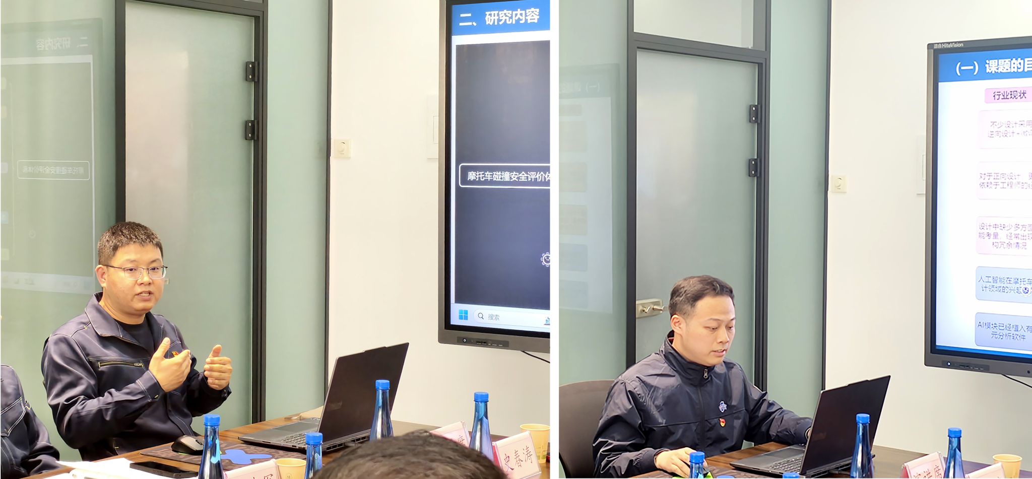 汇报课题覆盖摩托车研发多个关键技术方向,展现出青年人才在摩托车碰撞研究、数字化开发、动力系统优化与智能网联等领域的积极探索。