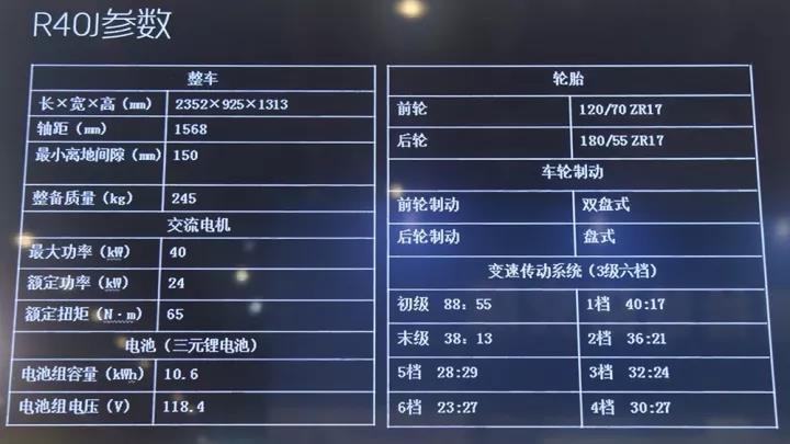 配置方面,这款R40J也是非常有特色的。其搭载额定功率为24KW的中置电机,最大功率能达到40KW。这款车型还搭载了3级6档位的变速箱。
