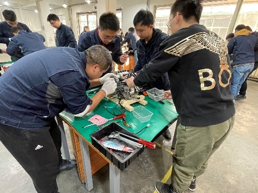 本次技能大赛主要内容是行业用量最大的CG150发动机拆装。准备工作前后历经1个半月。所工会组织了专题现场培训,发动职工利用业余时间进行练习,最后由来自七个部门的年轻职工,组成了四个代表队,参加了比赛。比赛现场气氛热烈,选手们全神贯注,你追我赶,迅速而精准完成了发动机拆装的各项规定动作,活动获得圆满成功。