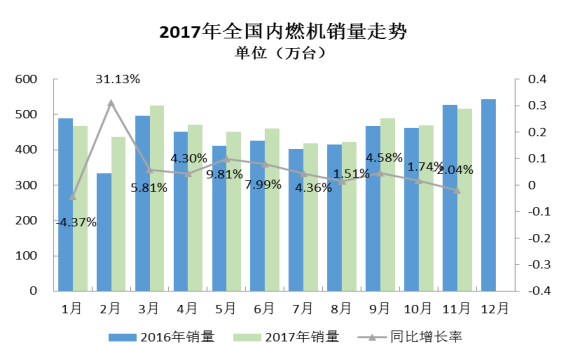 根据中国内燃机工业协会《中国内燃机工业销售月报》重点企业数据显示,数量方面,2017年11月完成内燃机销量[ 包含105家内燃机整机企业及摩托车发动机数据]516.07万台,环比增长9.97%,同比下降2.04%;累计完成销量5125.78万台,累计同比增长5.04%;功率方面,2017年11月完成26733.03万千瓦,环比增长13.93%,同比增长3.87%,累计完成241540.18万千瓦,累计同比增长10.30%。销量环比小幅增长,同比小幅下降,累计销量增加仍比较明显。汽油机市场、柴油机市场同比均小幅下降,累计销量涨幅有所回落;各细分市场销量中,除通机用内燃机环比下降外,其他均不同程度增长;累计销量同比除船用、通机用内燃机有一定下降外,其余销量仍表现为不同幅度增长状态。