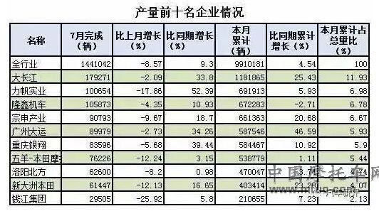 隆鑫、力帆、银翔、广州大运、宗申、大长江、五羊-本田、新大洲本田、航天巴山和广州豪进。与上年同期相比,五羊-本田出口量微降,隆鑫和新大洲本田略增,其他七家企业均呈两位数较快增长。1~7月,上述十家企业共出口264.36万辆,占摩托车出口总量的59.54%。