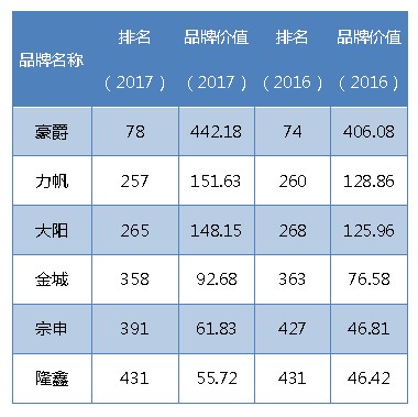 入围2017年《中国500最具价值品牌》的摩托车企业共有6家,但力帆被归类到汽车领域,金城被归类到机械领域。由于这两家品牌目前在国内仍然经营摩托车业务,因此笔者将它们归为摩托车领域进行讨论。