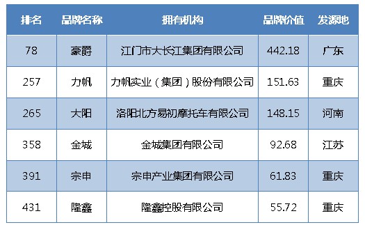 接下来,我们看看入围《中国500最具价值品牌》的摩托车企业分别有哪些。