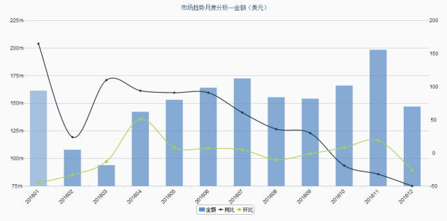 月度出口金额同比下跌最大的月份是2016年12月,14,706万美元,同比幅度-50%;同比上涨最大的月份是2016年1月,16,155万美元,同比幅度165%。