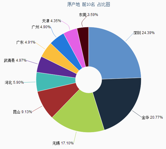 共有261个地区出口,出口总金额约为181,718万美元。其中出口排名前三位的市场分别为:深圳,金华,无锡。深圳出口金额约为31,629万美元,占总出口金额的17.41%;金华出口金额约为26,938万美元,占总出口金额的14.82%;无锡出口金额约为22,179万美元,占总出口金额的12.21%。