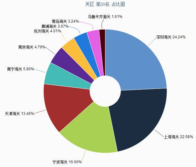 共有35个出口关区,出口总金额约为181,718万美元。其中出口关区排名前三位分别为:深圳海关,上海海关,宁波海关。深圳海关出口金额约为41,514万美元,占总出口金额的22.85%;上海海关出口金额约为38,666万美元,占总出口金额的21.28%;宁波海关出口金额约为28,437万美元,占总出口金额的15.65%。
