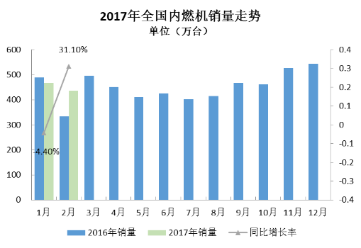 2017年2月,柴油机市场稳步回升,汽油机平稳增长;各细分行业除船用、发电机组有小幅下降外,其余销量均出现不同程度涨幅。