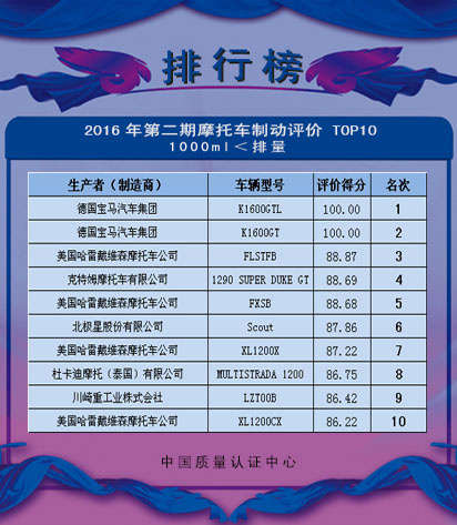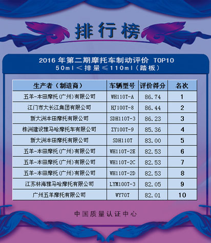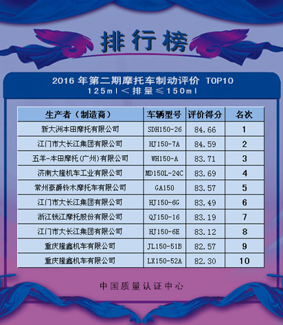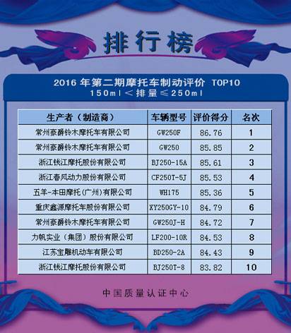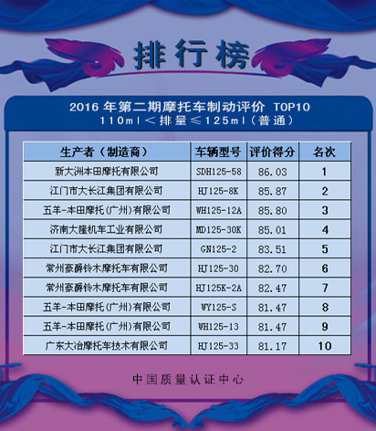 中国质量认证中心(CQC)、中国汽车工业协会摩托车分会(CAAM Motorcycle)和天津摩托车技术中心(TMTC)根据《机动车系统评价规则 两轮摩托车制动性能》的规定,将2016年第二期两轮摩托车制动性能系统评价TOP10,予以公告。