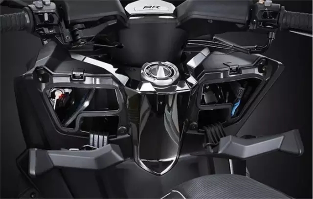 在配置上,AK550不敢松懈,全车采用LED光源。前座的“靠背”可以通过工具进行调节,车座下的空间无法容纳两顶全盔,但一个全盔和一个半盔还是没问题的。在车把下方还有两个储物箱,内有USB充电接口,还贴心地设计了手把加热,而无钥匙启动也是该车的一大亮点。