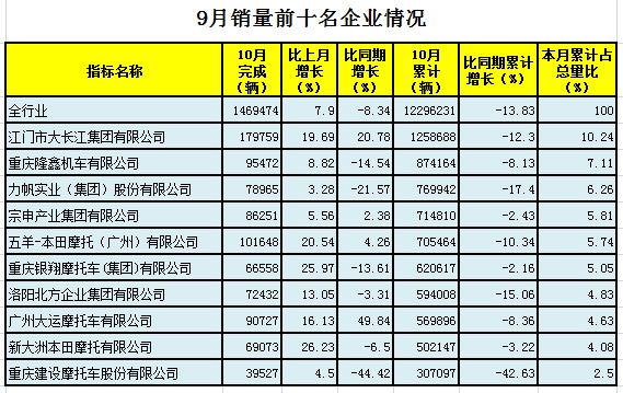 9月,110ml摩托车产销20万辆和20.1万辆,环比增长19%和14%,同比下降16.06%和14.05%。1~9月,110ml摩托车产销185.06万辆和187.73万辆,同比下降19.15%和17.54%,销量占两轮摩托车总销量的17.4%。