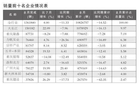 1~8月,摩托车销售前十名企业(集团)为大长江、隆鑫、力帆、宗申、五羊-本田、银翔、北方企业、广州大运、新大洲本田和建设股份,分别销售107.89万辆、77.87万辆、69.1万辆、62.86万辆、60.38万辆、55.41万辆、52.16万辆、47.92万辆、43.31万辆和26.76万辆。与上年同期相比,10家企业销售量均呈不同程度下降,其中建设股份降幅显著。1~8月,上述十家企业累计销售603.64万辆,占摩托车总销量的55.75%,比上年同期提升0.91个百分点。