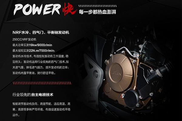 国内市面上,中大排量已成为摩托车的主流配置。力帆摩托基于深厚的研发技术,为KP250配备了水冷电喷四气门发动机,从参数上来看,该款发动机最大功率19kW,最大扭矩22N8226;m,处于国内同排量车型的上游水准。