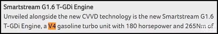 据悉,首台配备CVVD技术的发动机是Smartstream G1.6 T-GDi涡轮增压缸内直喷发动机,最大输出180hp/265Nm。这款发动机直喷系统的喷油压力达到了350 bar,而现有T-GDi发动机的喷油压力只有250 bar。此外,由于低摩擦组件的应用,发动机的内部摩擦减少34%……不过有意思的是,现代官方宣称这款发动机是V4发动机,然而从视频中看,这台发动机却是直列4缸发动机。