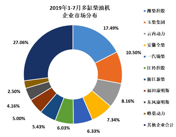 受商用车持续下滑影响,配套商用车市场达60.80%的多缸柴油机销量同样出现下滑。7月多缸柴油机市场销量环比、同比快速下降,同比累计小幅下降。7月,多缸柴油机企业共销售27.25万台,环比增长-12.19%,同比增长-7.57%,累计销量256.02万台,同比增长-3.97%。分企业看,潍柴、玉柴、云内、全柴、锡柴、江铃、新柴、福康、东康、蜂巢动力前十名销量占总销量的72.94%,前十集中度较上月(73.30%)略有下降;市场份额占比中:潍柴17.49%;玉柴11.50%;云内、全柴、锡柴6.3%~8.2%,江铃、新柴、福康5.0%~6.0%;东康、蜂巢动力2.5%~4.2%。