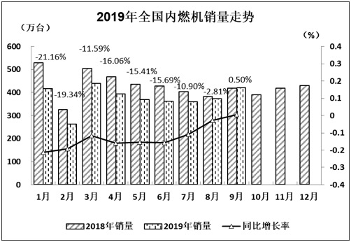 根据中国内燃机工业协会《中国内燃机工业销售月报》数据, 9月,全国内燃机当月销量环比较大幅度增长,与上年同月比基本持平;其中柴油机表现突出,环比、同比均增长,且环比增幅超20%,汽油机环比增长,同比基本持平。1-9月,内燃机销量同比降幅较上月有所收窄,但仍延续了18年2月以来负增长的态势,其中柴油机、汽油机销量降幅均略有收窄。究其原因,主要是:9月是终端市场传统旺季,汽车、工程机械、农机、摩托车市场均表现较好,环比呈现较大增长;但与同期相比,销量低于去年同期水平。1-9月的累计销量仍呈负增长态势。贸易摩擦的影响延续,行业经济下行的风险依然存在,由于行业大企业抗风险能力强且权重高,行业经济总体保持基本平稳运行状态。