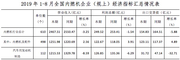 据内燃机工业(含内燃机及配件制造业和汽车发动机制造业)610家独立核算的规上企业汇总数据,1-8月内燃机行业经济运行三大指标同比均出现负增长,行业经济运行基本在合理运行期间。从相关分析指标看,减税降费新政利好的影响相对有限,不确定性因素较多,经济活力增长略显乏力,企业仍面临着很多困难。但行业企业重视及加强了各种管理,经营管理质量有所提高。特别是在降成本、合理运用资金上有提升。虽然经济下行的风险依然存在,但随着国家落实降低实际利率水平的措施,以及利用定向降准等工具,加大对实体经济支持的力度,相信内燃机行业经济运行在合理区间是可期的。