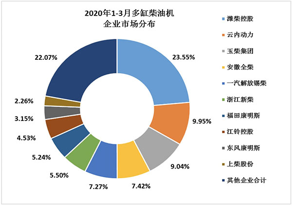 多缸柴油机主要配套商用车市场,市场销量环比增长,同比及累计同比下降,下降幅度小于行业整体下降幅度。3月,多缸柴油机企业共销售44.63万台,环比增长180.85%,同比增长-15.33%;1-3月累计销量96.94万台,同比增长-20.28%。特别值得指出的是潍柴、一汽解放(锡柴)累计销量处于正增长态势。分企业看,潍柴、云内、玉柴、全柴、一汽解放(锡柴)、新柴、福康、江铃、东康、上柴前十名销量占总销量的77.93%;市场份额占比中:潍柴23.55%、云内9.95%、玉柴9.04%、全柴7.42%、一汽解放(锡柴)7.27%、新柴5.50%、福康5.24%、江铃4.53%、东康3.15%、上柴2.26%。