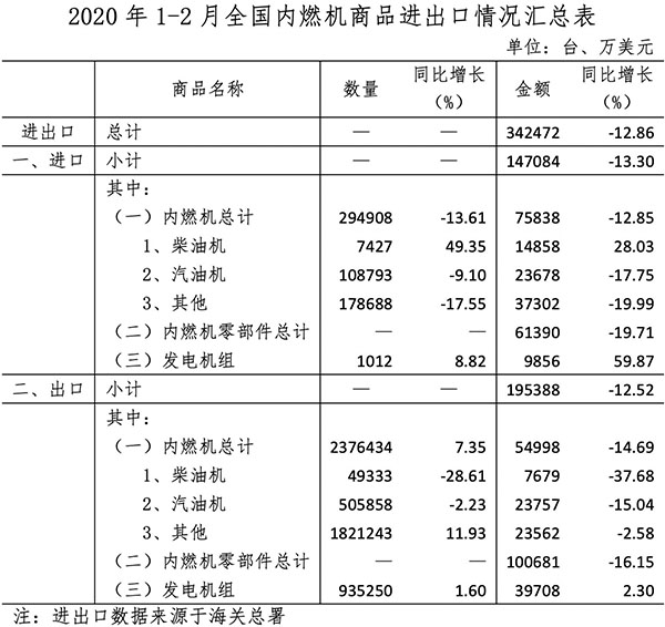 新冠肺炎这一突发事件对行业影响巨大,1-2月内燃机工业经济总体出现了大幅下滑。据内燃机工业(含内燃机及配件制造业和汽车发动机制造业)587家规模以上汇总数据, 1-2月内燃机行业主营业务收入433.4亿元,同比增长-20.04%,其中:内燃机及配件行业227.99亿元,同比增长-15.22%,汽车发动机制造业205.41亿元,同比增长-24.78;利润总额33.08亿元,同比增长-37.36%,其中:内燃机及配件行业18.14亿元,同比增长-26.13%,汽车发动机制造业14,94亿元,同比增长-47.12%;出口交货值20.84亿元,同比增长-45.79%,其中:内燃机及配件行业16.93亿元,同比增长-37.47,汽车发动机制造业3.91亿元,同比增长-65.60%。