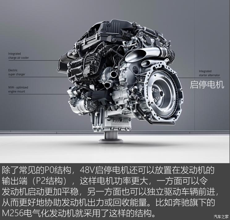 相比传统的自动启停系统,48V微混系统可以在更多的工况下令发动机熄火。以奥迪为例,当车速在55-160km/h时松开油门踏板,系统判定车辆处于滑行状态,就可以令发动机熄火同时变速器挂入空挡;而当车辆逐渐减速至停车时,当车速降至22km/h时它也可以令发动机熄火滑行。而电气系统此时可以驱动必须的电气附件,来达到进一步降低油耗的效果。从结构图中可以看到,这台启停发电机位于发动机前端,通过皮带同发动机曲轴相连,这被称为是P0结构的混动系统。