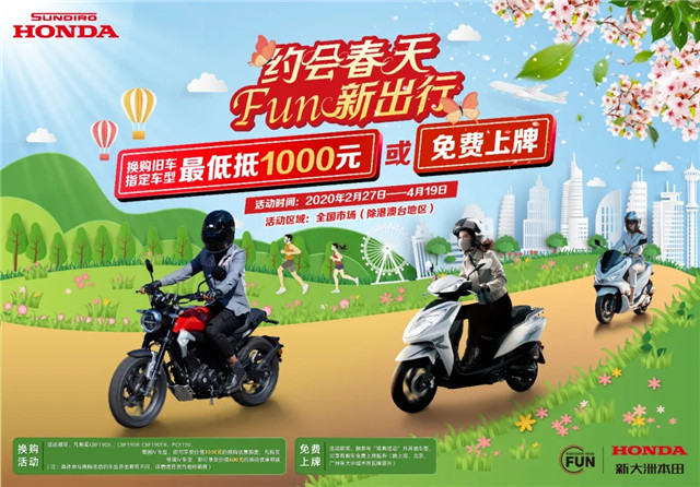 以新大洲本田为例,疫情期间上线了主题为“约会春天,FUN新出行”的年后首次优惠促销活动。除部分线下互动外,活动整体侧重线上销售,将新大洲本田京东官方旗舰店、天猫官方旗舰店、苏宁官方旗舰店作为主战场,用极具诚意的方式为车友们解锁线上购车新姿势。