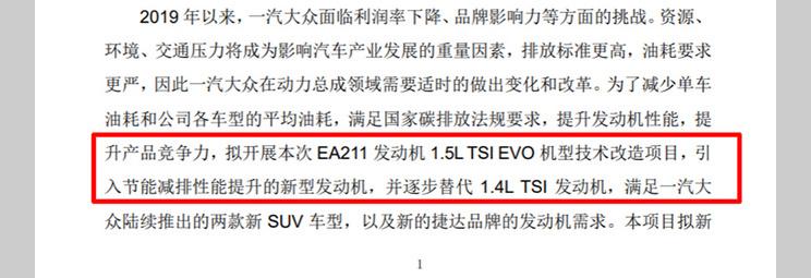 我们此前曾曝光过一汽-大众投产1.5TSI evo发动机的消息。相关文件显示,一汽-大众成都工厂的1.5TSI evo发动机技术改造项目已经在2019年8月向属地发改局备案,项目建成后,1.5TSI evo发动机的产能可达60万台/年。后续,该发动机将会代替大众使用多年的EA211 1.4TSI发动机,应用到一汽-大众旗下大众品牌新车和捷达品牌车型上。