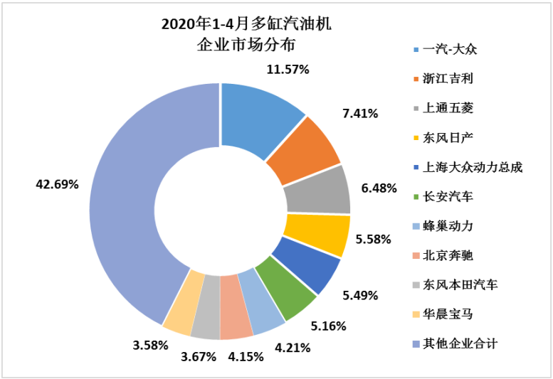 多缸汽油机主要配套乘用车市场4月产销明显回升,环比继续保持较快增长,同比降幅趋缓。多缸汽油机销量环比较快增长,同比增长,累计同比降幅收窄。4月销售151.85万台,环比增长49.67%,同比增长2.18%;1-4月累计销量412.43万台,同比增长-32.82%。在55家多缸汽油机企业中一汽大众、浙江吉利、上汽通用五菱等十家销量排在前列,其总体销量占行业销量的57.31%。乘用车用在多缸汽油机占比为96.49%,4月销售147.32万台,环比增长49.31%,同比增长1.20%;1-4月累计销量397.97万台,同比增长-33.79%。企业的累计销量降幅区间主要集中在-10%~-40%,降幅已较上月好转。