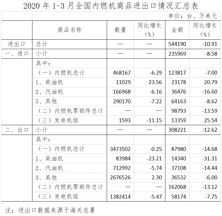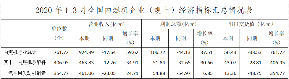 受新冠肺炎影响1-3月内燃机工业经济数据较1-2月比未见明显变化,三大指标中主营业务收入、出口交货值降幅略有收窄,利润总额降幅继续扩大。