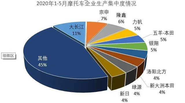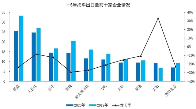 1-5月,摩托车销售前十名企业(集团)为大长江、宗申、隆鑫、力帆、五羊-本田、银翔、洛阳北方、新大洲本田、绿源、新日,分别销售62.24万辆、38.6万辆、37.47万辆、29.32万辆、26.6万辆、26.39万辆、25.97万辆、24.08万辆、22万辆和21.23万辆。上述十家企业累计销售313.88万辆,约占摩托车总销量的54.82%。