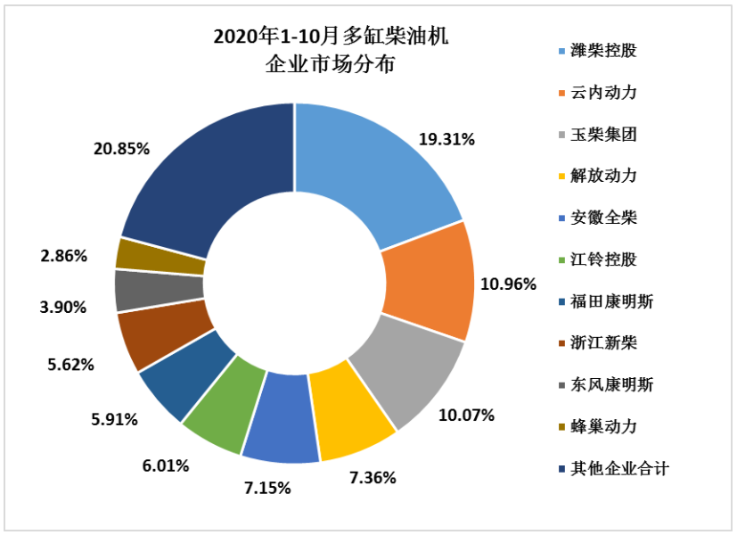 多缸柴油机主要配套的商用车市场同比高速增长,带动多缸柴油机市场也出现较大增幅。10月,多缸柴油机企业共销售45.86万台,环比增长-9.97%,同比增长23.15%;1-10月累计销量435.16万台,同比增长20.66%。特别值得指出的是潍柴、云内、福康、新柴、蜂巢动力、上柴、东风商用车、一拖洛阳、广康等累计同比增幅均在30%以上。分企业看,潍柴、云内、玉柴、解放动力、全柴、江铃、福康、新柴、东康、蜂巢动力前十名销量占总销量的79.15%;市场份额占比中:潍柴19.31%、云内10.96%、玉柴10.07%、解放动力7.36%、全柴7.15%、江铃6.01%、福康5.91%、新柴5.62%、东康3.90%、蜂巢动力2.86%。