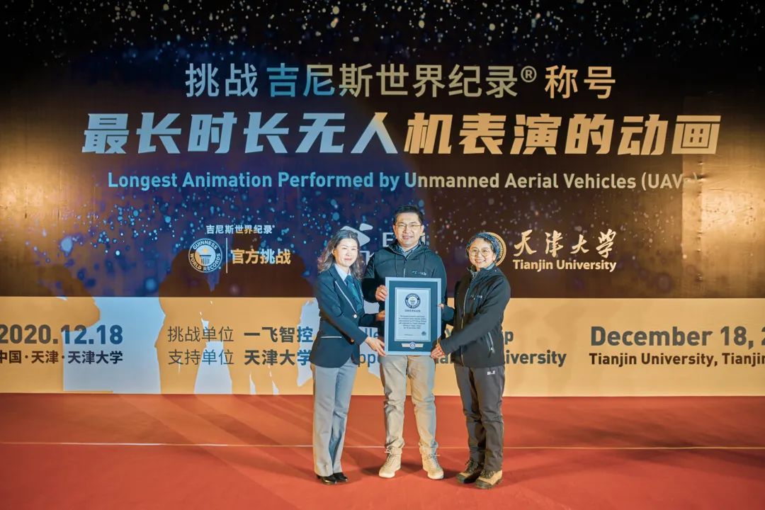 2020年12月18日,全球智能工业级无人机领军企业一飞智控在天津大学成功获得吉尼斯世界纪录称号——“最长时长无人机表演的动画”!