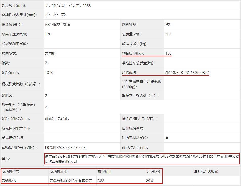 这次申报的凯越321RR和现款没有变化,发动机生产企业现在是凯越自己的了,整备质量还下降了1kg。
