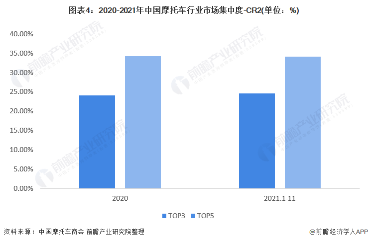 总体来看,我国摩托车行业的市场集中度并不高,从销量来看,2021年1-11月,摩托车行业CR3占比从2020年的24.05%增长至24.62%,CR5占比从2020年的34.26%下降至34.10%。整体来看,行业集中度一般。
