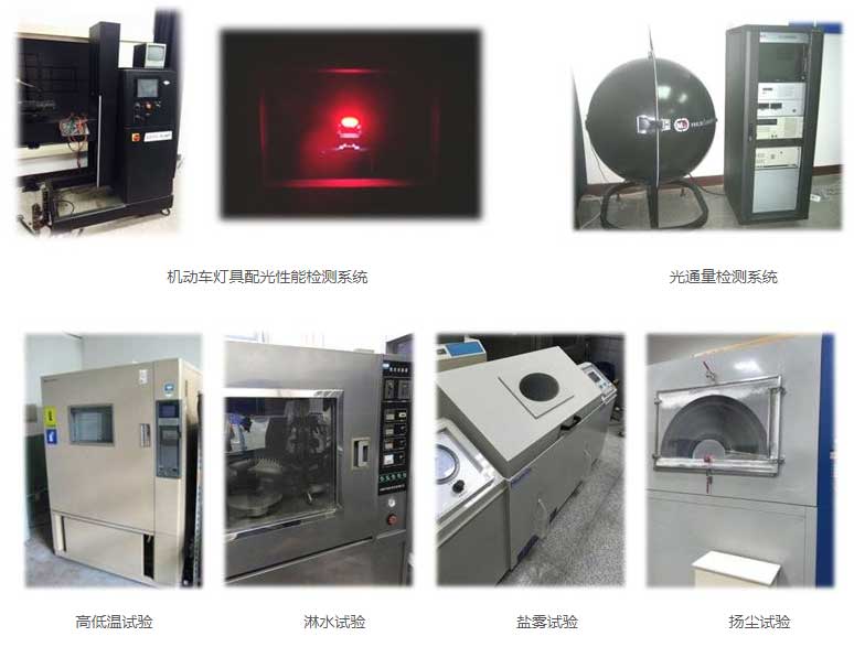 试验设备包括机动车灯具配光性能检测系统、光通量检测系统、彩色亮度计、标准灯泡、盐雾箱、高低温试验箱、淋水试验箱、沙尘试验箱等,可以满足各类机动车灯具试验的要求。